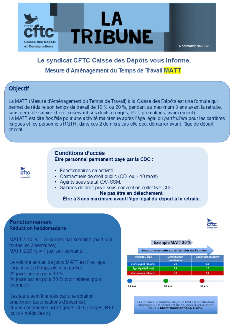 4 Nov 2025 | Accords CDC, Actualités, Autorisations d'absences/Congés/Jours de bonification/RTT..., Droit privé, Egalité femmes/hommes, Fonctionnaires, La Tribune Syndicale, MATT, Publications, Retraite, Statutaires CANSSM, Syndicat CFTC-CDC